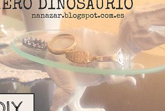 Comencemos pues con este joyero de dinosaurio hecho solo con un juguete de un Tyrannosaurus rex y un plato de cristal que compré en un bazar asiático por menos de 1€. (1) Así que no tienes excusa para hacer este maravilloso soporte tan original.Lo primero que vamos a hacer es pintar el dinosaurio, yo he elegido pintura en spray porque con el buen tiempo que hace se seca enseguida y llega a todos lados. Recuerda dejar al menos 20 cm para que no se acumule la pintura y salgan gotas antiestéticas. (2)Ahora llega la parte difícil, y no digo difícil porque lo sea, sino porque yo soy demasiado torpe para esto. Mide a tu gusto por donde quieres que el dinosaurio esté dividido. Para ello debes tener en cuenta dos cosas: la primera es que tienes dejar bastante soporte, es decir, el tronco y las patas de abajo, ya que necesitas que tenga una base fuerte. Y la segunda es que debes cortarlo lo más recto posible para que tu plato esté, valga la redundancia, recto. (3)Y ya solo debemos cortarlo, con lo que tú prefieras, yo empecé con un cúter profesional y acabé con un cuchillo jamonero, no te digo más. Luego lo vamos a lijar un poco si ves que te ha quedado desigual, porque recuerda que tu plato es llano o un poco arqueado, pintamos la parte de dentro si queremos, y lo pegamos al plato. (4)