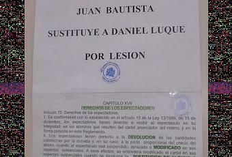 Acabo de llegar del sorteo y la primera sorpresa ya estaba colgada en la taquilla. En un escueto cartel, se hacía constar que el francés Juan Bautista sustituirá a Daniel Luque "por lesión". Ni más parte médico, ni más explicaciones por parte de la empresa. Debajo el párrafo del Reglamento Taurino en el que se recogen los derechos de los espectadores sobre la devolución de entradas en caso de que uno de los espadas anunciados se caiga del cartel. Y devoluciones, a las 12:30 de la mañana, ya se habían producido, varias de ellas, cito textualmente lo que me ha comentado un aficionado desplazado desde Lucena, "porque Luque era el único que daba lustre al cartel". La frase viene que ni pintada a colación de que la presencia del diestro de Gerena fue "vendida", tanto por el Ayuntamiento como por la empresa, como uno de los grandes atractivos del festejo, que ahora, la verdad sea dicha, queda un poco cojo.