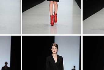La colección presentaba una mujer envuelta en las líneas rectas de abrigos y vestidos en negro, destacando los toques rojos, las flores y los volantes. En ciertos momentos la colección parecía querer llevarnos al pasado, pero rápidamente volvíamos a la actualidad, pues se sucedían los vestidos inspirados en diferentes épocas.