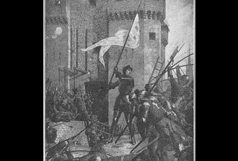 Cuando solo quedaba el más fuerte y Joan lideraba la fuerza atacante, recibió una herida leve y fue sacada de la batalla para ser atendida por un cirujano. Sus soldados comenzaron a retirarse. "Espera", le ordenó, "come, bebe y descansa, porque en cuanto me recupere tocaré las paredes con mi estandarte y entrarás al fuerte". Página 252En pocos minutos se montó en su caballo y montar de nuevo rápidamente hasta la fortaleza, la tocó con su bandera. Su soldado casi lo cargó al instante. Al día siguiente, las tropas enemigas se vieron obligadas a retirarse de la ciudad y el asedio fue al final.