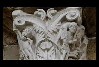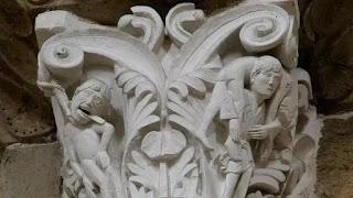 En lo alto, en el primer capitel que se ve al entrar, en una parte aparece Judas colgado, con la lengua de fuera, rodeado por diablos. En la otra parte del capitel: hay un hombre que lleva sobre los hombros el cuerpo de Judas. Este hombre tiene una mueca extraña: la mitad de la boca sonríe y la otra mitad está fruncida. El hombre representado lleva una túnica corta y es un pastor. Es el Buen Pastor que lleva sobre sus hombros a la oveja perdida, esa en cuya búsqueda fue dejando a las otras 99 en el redil. El artista que esculpió la escena y el monje que la inspiró quisieron representar algo extremo llegando a proponer que incluso Judas tuvo acceso a la salvación."Judas sobre los hombros del buen pastor" de Eduardo Sanz de Miguel, ocd