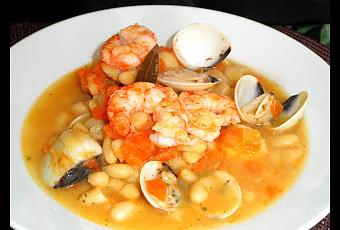 En la olla exprés cocer las judías blancas con unas hojas de laurel y un puñado de sal. En un cazo aparte, abrir las almejas con un poco de agua.En una cazuela poner cuatro cucharadas de aceite, añadir cebolla y ajos picados. Antes de que se doren añadir las gambas peladas, sofreir ligeramente.