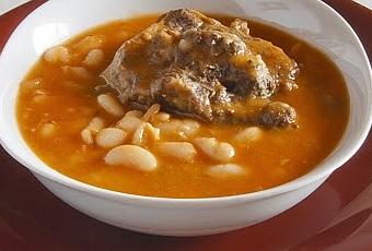 Vamos con otro guiso suculento, nutritivo y deliciosamente reconstituyente para estos fresquitos días de los que ya disfrutamos. La carne del rabo de buey tiene un elevado contenido en hierro y en vitaminas del grupo B y es muy rica en grasa intramuscular, lo que la confiere un acabado muy jugoso y una textura melosa muy adecuada para un guiso como este. Es, eso sí, un plato no apto para dietas, pero de vez en cuando, no viene mal darle un capricho al cuerpo. Las judías (también llamadas alubias, que luego algunos lectores se me lían si utilizo uno u otro término indistintamente) tienen un bajo aporte calórico, en contra de lo que se cree, así que el guiso se equilibra. Como además el efecto saciante de las legumbres es alto no hace falta ponerse ciego para quedar satisfecho con esta receta. Como el tiempo de cocción de las judías y del rabo de buey son distintos, aconsejo hacerlos por separado y mezclarlos al final dándolos un ligero hervor para mezclar los sabores. Y como todos los guisos, estará mucho más rico si lo dejamos reposar un tiempo.Ingredientes para cuatro personas1 1/2 de rabo de buey (vaca... ternera...)750 gr de judías blancasUna cebolla grandecitaDos tomatesDos clavos de olorDos hojas de laurelDos dientes de ajo1/2 cucharadita de cominosUna cucharadita de pimentónUn vaso de brandy1 l de caldo de verdurasSalPimientaAceite de oliva.