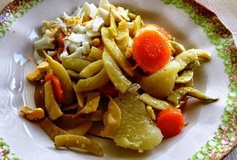 Pon agua con sal a calentar en una cacerola, echa las judías troceadas, lavadas y sin los cabitos junto con las patatas peladas y troceadas. Añade también las zanahorias peladas ( quizás si las zanahorias son más duras que las judías , sería mejor que las cocieras aparte ) y cortadas en rodajas. Cuando estén tiernas retira y escurre .Pon aceite a calentar en el fondo de una sartén. Dora los ajos laminados. Incorpora las judías , patatas y zanahorias reservadas. Rectifica de sal y añade pimienta y nuez moscada. Saltear todo junto.Sirve acompañadas de huevo duro picado o frito.