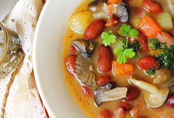 Traigo uno de judías pintas con tropezones varios y mucho sabor que lo adquiere con la combinación de chorizo y setas.