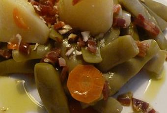 Mientras se templan un poco para no tomarlas muy calientes, picamos finamente en la tabla de madera unos taquitos de jamón o en su defecto tres o cuatro lonchas de jamón serrano. Picamos también en el mortero las almendras dejándolas gruesas y las juntamos con el jamón picado. Servimos las judías verdes y encima repartimos la picada a cada comensal. Espolvoreamos pimentón y un hilo de aceite de oliva.