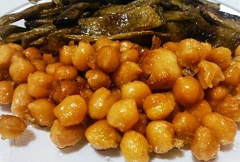 - Añadimos las judías verdes, los garbanzos y la sal.