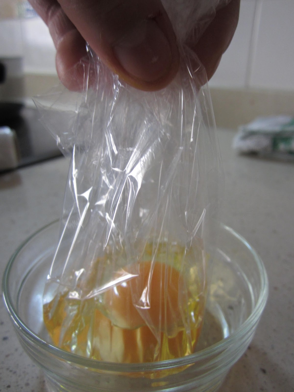 En un cazo ponemos agua a hervir y vamos a preparar unos huevos pochados, para cambiar del típico huevo duro.Ponemos en un bol film de cocina y dentro una gota de aceite y cascamos un huevo.Atamos el film sobrante para hacer un paquete con el huevo.Lo introducimos en el agua hirviendo durante 5 minutos , para que quede la clara hecha pero la yema quede tierna.Con imágenes quedará muy claro el proceso: