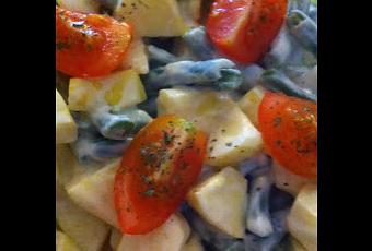 - Sirve las judías, bien escurridas, la manzana, sin pelar y sin la parte del centro, cortada en dados, mezcla con la salsa y decora con los tomates cherry cortados en cuatro trozos y perejil picado (opcional).