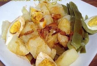 - En una sartén con un poco de aceite, rehogar unos dientes de ajo pelados y en láminas; cuando estén dorados añadir pimentón dulce y un poco de pimentón picante, dar unas vueltas, añadir un poco del agua reservada, remover, añadir un chorrito de vinagre y una chispa de sal. Remover unos minutos hasta que espese. Servir las judías, las patatas troceadas y los huevos con un poco de la ajada por encima.