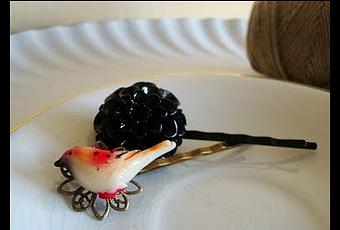 Juego de dos horquillas. Una lleva un cabujón negro de flor y la otra, un precioso pajarillo.