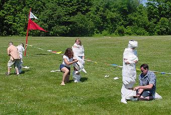 Después se le da un rollo de papel higénico a cada pareja. Un niño envuelve el otro niño con el papel higénico y debe parecerse a una momia.