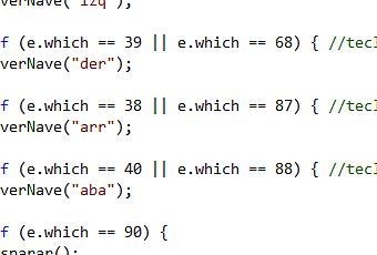 Observar tambien que en cada if se validan dos teclas, esto es porque tuve que añadir la opcion de mover la nave con las teclas W,S,D,X ya que el juego al estar insertado en el blog, si un usuario presionaba flecha abajo, se movia la nave en esa direccion pero a la vez se movia tambien el propio blog hacia abajo.