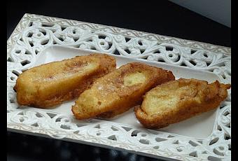 Cortar el pan en rebanadas de mas de un centímetro.Calentar la leche con las ramitas de canela y con el azúcar.Dejamos enfriar la leche antes de mojar en ella las rebanadas de pan porque si lo hacemos en caliente se reblandecen demasiado y el pan se nos romperá.Una vez remojadas las pasamos por huevo batido y las freímos en aceite bien caliente.Las escurrimos bien con un papel secante para quitar el exceso de aceite, las rebozamos en azúcar y canela y ya las tenemos listas para comer.