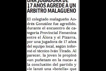 Al término del citado choque, que acabó con la victoria del Atlético Pizarra sobre el Álora por 2 a 5, el partido 'explotó'. El entrenador, el delegado y una de las jugadoras del conjunto local fueron expulsados por insultar y faltar al respeto del colegiado. Pero lo peor tuvo lugar cuando otra de las jugadoras del Álora perdió el control por completo, y terminó agrediendo al colegiado, lo que quedó reflejado en el acta del choque.S. F. C., con el dorsal número 10 a su espalda, acudió hacia el árbitro, y cuando éste le dio la espalda, le propinó un puñetazo en la nuca y, posteriormente, le lanzó una botella llena de líquido que impactó sobre su rodilla derecha. Por fortuna, a pesar de todo lo sucedido, el colegiado del encuentro no sufrió ninguna secuela física más que las heridas propias de dicho ataque.Resumen de http://www.elconfidencial.com/ Captura imagen: QUE es