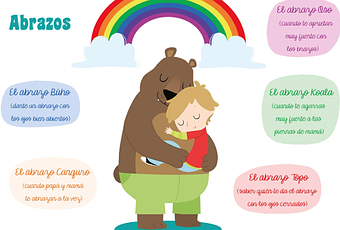 Mi hija lo miraba a mi lado y se sintió atraída por los dibujos, le conté de qué se trataba, y así hoy aprendimos nuevos tipos de abrazos y de besos! Ya hemos impreso el poster de los mimos para practicarlo y sumar los que sabemos o inventamos nosotras.