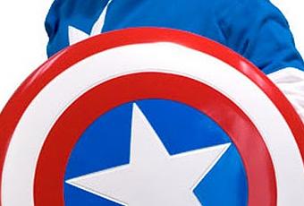 Por ejemplo, con tener el escudo del Capitán América. Si en la infancia hubiera sido chulo parar con él los furibundos ataques de los malvados de la Plaza de Arriba, ahora no estaría de más para desviar tanta mala leche que se destila en algunas circunstancias. La tontería, de 61 cm de diámetro (más que suficiente para parar insultos medios) sale por 25 $ en 80stees.com. No es necesario vestirse como el tipo de la foto, que una cosa es disfrutar como un crío y otra… . en fin.
