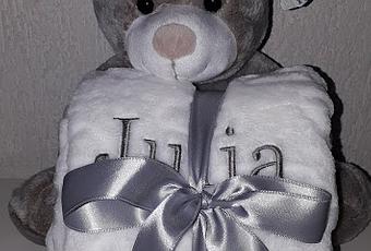 Y para ella, le preparamos una mantita con su nombre bordado, y guardando esa mantita, un peluchito que estamos seguras de que se convertirá en el compañero inseparable de la peque.