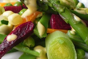 Servir las verduras regadas generosamente con la deliciosa vinagreta de mango……
