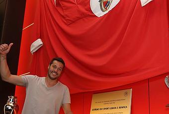 El guardameta posando con algunos trofeos y una camisa gigante del club de Lisboa.