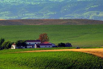 Cortijo con fondo de Sierra Morena. Autor, Manuel Romero