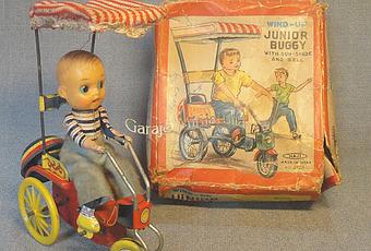 También los juguetes a cuerda eran muy populares. Era la forma de darle movimiento a vehículos, animales o muñecos. Tal como el Junior Buggy, que además podía remover su techo.