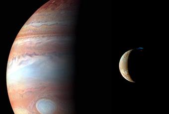 Esta bonita imagen es un montaje de diferentes fotografías realizadas por la sonda New Horizons – lanzada en 2006 – durante su sobrevuelo de Júpiter de la nave a principios de 2007. En ella podemos ver a Júpiter y a su volcánico satélite Ío.