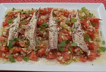 Prepara el picadillo cortando muy pequeñito todos los ingredientes y adereza con aceite, vinagre y sal. Coloca los lomos del pescado encima del picadillo y espolvorea por encima orégano seco y perejil fresco.