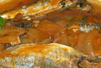 Elaboración Limpiamos los jureles y les sacamos la cabeza. Preparamos un adobo con los dientes de ajo picados menuditos, el perejil picado y un poco de aceite de oliva y los dejamos al menos tres horas antes de cocinarlos para que cojan bien el sabor del adobo. En el momento de su preparación, pelamos las cebollas y las picamos groseramente. Ponemos aceite de oliva en una olla, junto con una hoja de laurel y una pizca de sal y rehogamos las cebollas hasta que éstas se ablanden y se vuelvan ligeramente transparentes. A continuación agregamos la salsa de tomate y dejamos que se cocine durante cinco minutos. Pasado este tiempo, añadimos el vino blanco y comprobamos cómo está de sal (si fuera necesario añadiríamos más). Añadimos la pimienta negra recién molida y dejamos que se cocine todo junto otros cinco minutos. Incorporamos entonces los jureles, que habremos salado previamente, junto con el adobo. Éstos deben quedar bien cubiertos por la salsa para que se cocinen bien por todas partes (si fuera necesario añadiríamos algo de caldo de pescado hasta cubrirlos por completo). Cocinamos todo a fuego medio durante aproximadamente 20 minutos y servimos.