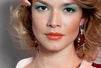 Para Holi (una marca que me encanta), Vero Momenti realizó un maquillaje muy colorido, alegre y con todas las tendencias. Ojos bien vibrantes en tonos cítricos verde y labios naranjas. Para el cabello, con los peinados realizados por Oscar Colombo y su equipo, muchas ondas y un aplique con forma flor. (el maquillaje es precioso y quiero copiarlo, pero esos poros me ponen nerviosa)