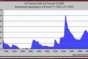 El miedo a la deuda la han exacerbado ciertos inversores que olvidan un poco de historia dado que el endeudamiento siempre ha existido. La gráfica muestra la deuda de Estados Unidos desde 1790 hasta hoy, es decir 220 años. Como vemos, la tendencia de la deuda fue aceleradamente decreciente desde fines de la segunda guerra mundial hasta 1981, año en que comienza a crecer nuevamente. Pero el gráfico da cuenta que endeudamiento siempre ha existido. El punto es que si cundió la deuda en los períodos de bonanza, ¿por qué no puede aumentar la deuda en este actual período de crisis? La gráfica muestra la forma en que aumentó la deuda en el período de la Gran Depresión: 1930-1940.