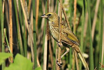 Un ave común en la zona pampeana, habitante de los pastizales y herbazales es el verdón (Embernagra platensis). En las imágenes se puede ver a un relativamente confiado juvenil vocalizando cerca de un juncal. Fotos tomadas en febrero de este año cerca del río Salado en inmediaciones de la localidad de Gorchs.