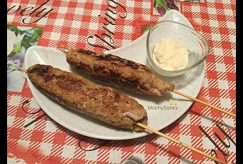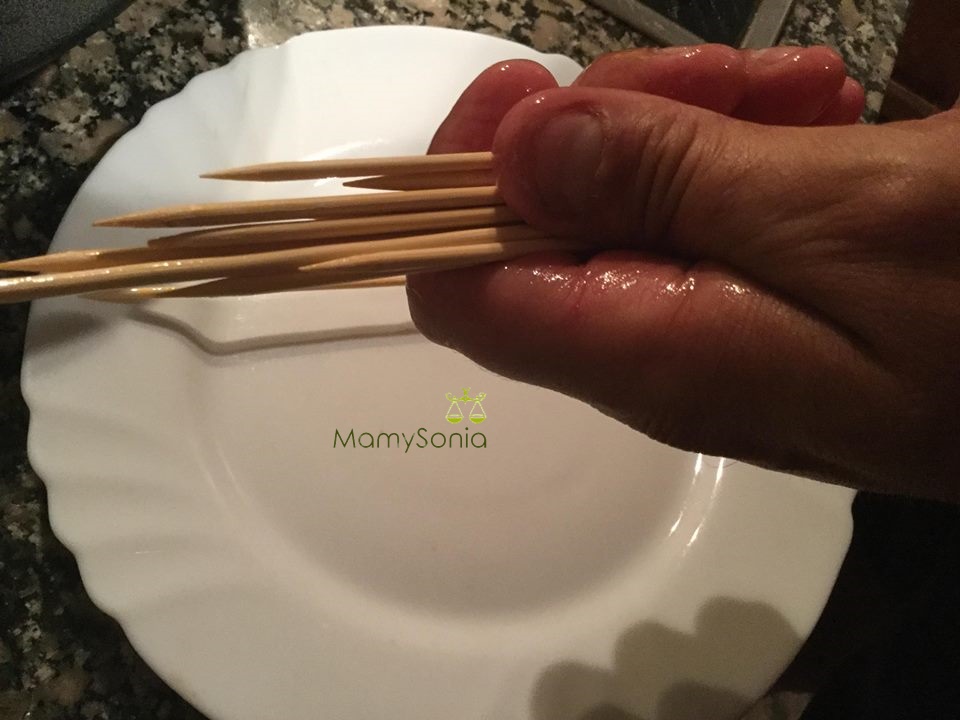 Ponemos aceite en un plato nos mojamos las manos e impregnamos los palos de brocheta