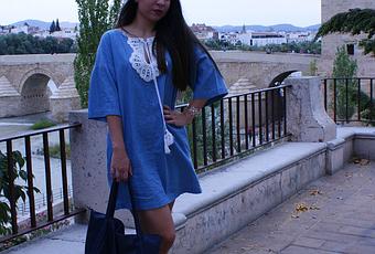 Llevo un kaftan en azul claro, que es una prenda de algodón suelta, y que por lo que vemos en todas las revistas de moda se va a convertir en la prenda estrella del verano, en la parte de la pechera tiene un bordado guipur que es un encaje con un bordado muy grueso, como veis, es muy bonito y le da un toque muy elegante acompañado de las borlas. Esta prenda es súper fresquita y queda muy it. Las sandalias son estas cangrejeras laminadas metalizadas, con la suela blanca, que es uno de los must en zapatos este verano. Para el bolso, el azul marino creo que contrasta muy bien con el azul claro del kaftan. Y por último para los complementos, unos pendientes de circonitas que podéis encontrar en la tienda on line , algo pequeñito que no llame demasiado la atención ya que el detalle que queremos destacar es el bordado, y una pulsera trasparente en forma de flor.