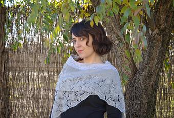 Está hecho con agujas circulares del 3,5 y lana Schachenmayr SUAVEL, gris clarita, de calidad de bebé, que se trabaja estupendamente y se bloquea muy bien. Para darle un poco más de cuerpo en la parte de arriba le añadí una hebra muy finita en blanco y las tejí juntas, por eso veréis dos tonos.
