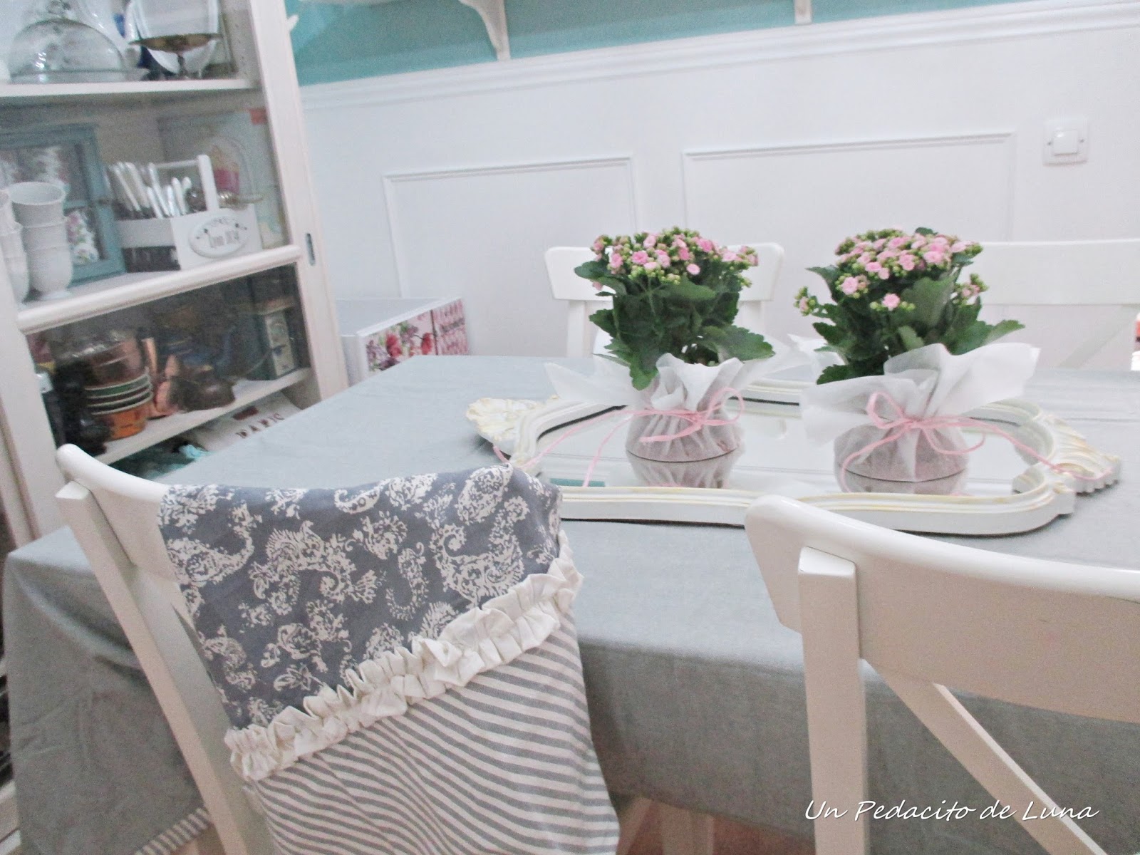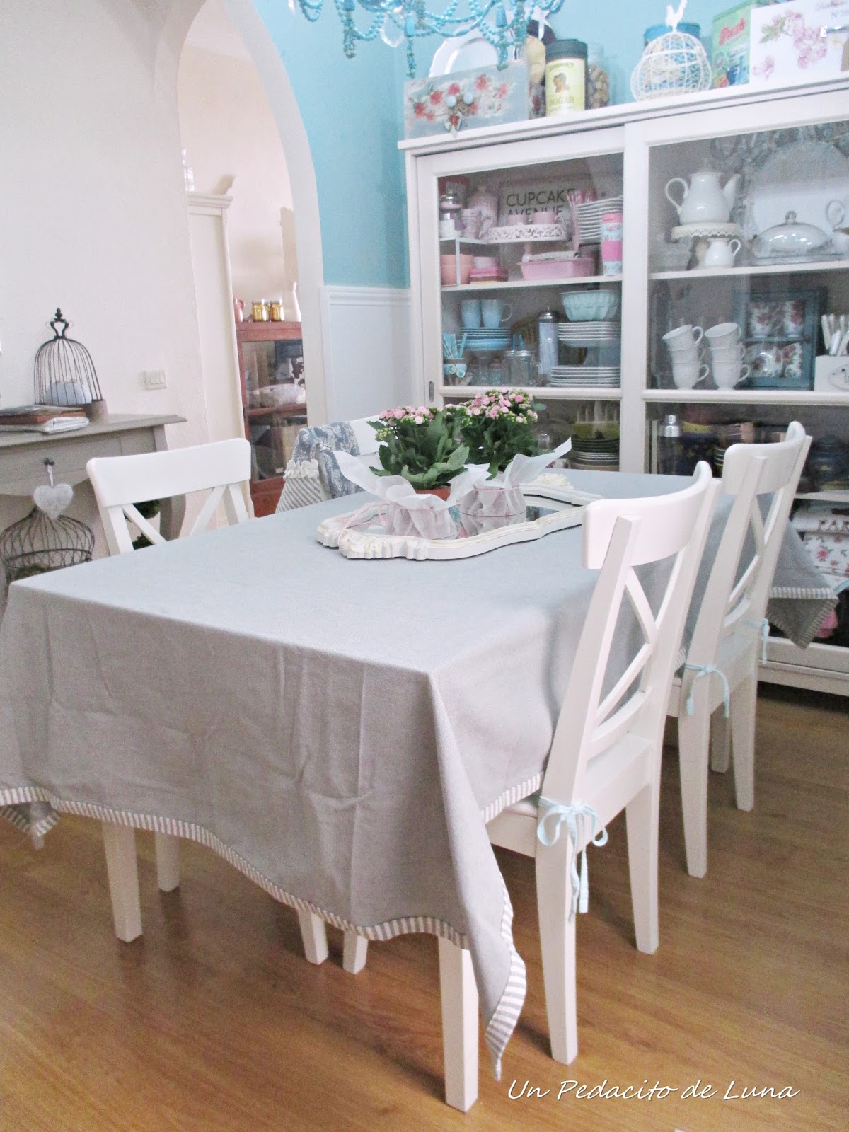 La mesa la cubrí con un mantel de loneta gris claro y ribeteado con la misma tela a rayas, también encontrado ayer en una firma irlandesa que con frecuencia me sorprende con sus artículos de casa.