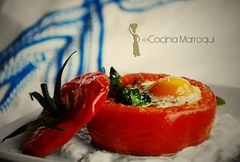 La kalia es el plato típico del desierto, una especie de pisto al que se le añaden pequeños trozos de carne y se corona con huevos, que se cuecen directamente en la tajine.Hay una receta, que consiste en tomates rellenos con cous-cous, que se elabora en el horno, de ahí nuestra adaptación.Se trata de hacer la kalia de la forma convencional y después rellenar los tomates, en el horno, acabaremos la receta y añadiremos los huevos.Ingredientes