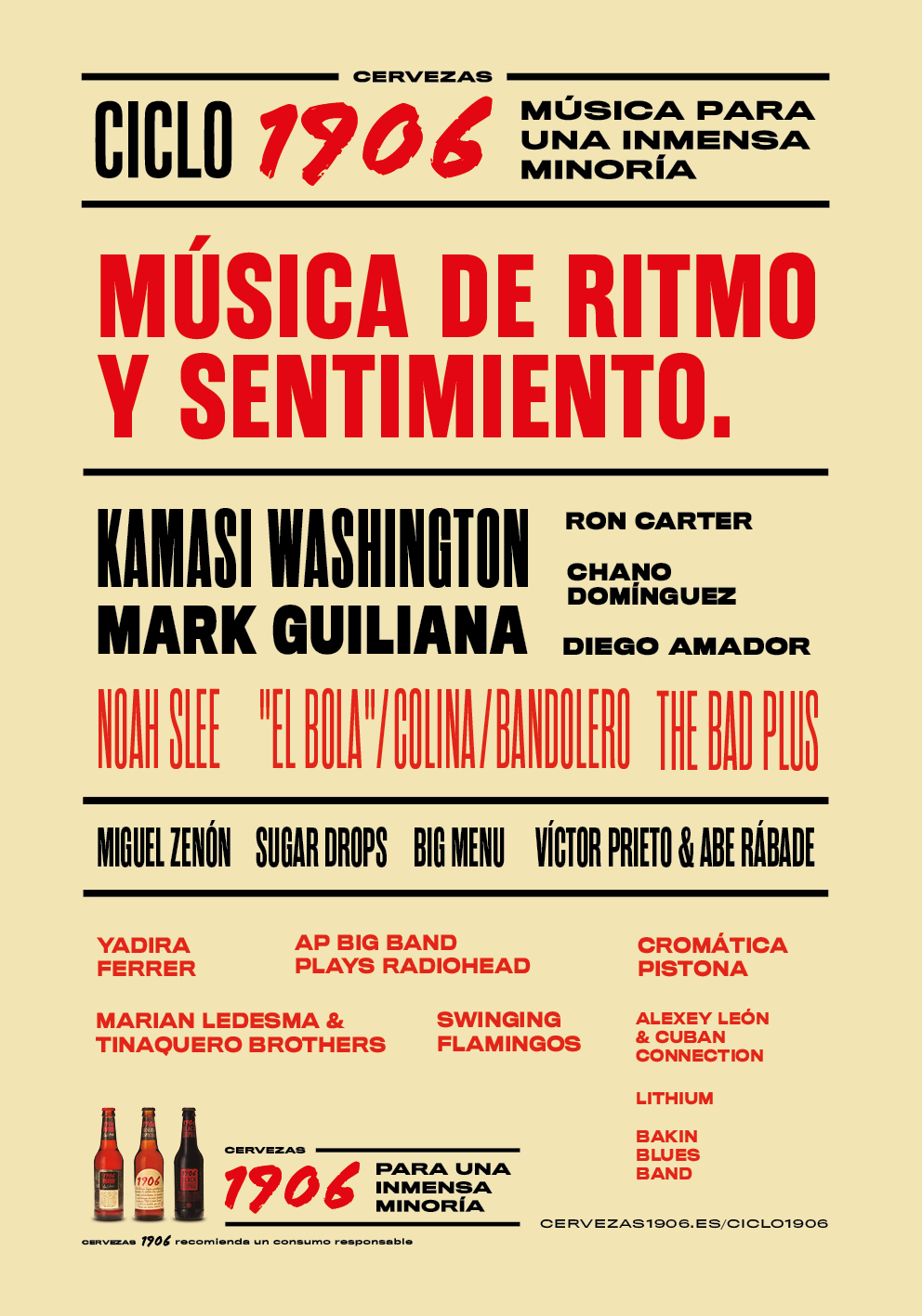 Hay quien opina que Kamasi Washington, saxofonista y compositor nacido en la ciudad de Los Angeles en 1981, ha venido al mundo para revitalizar por completo el jazz y, como prueba, su nuevo disco “Heaven & earth” editado por Young Turks (el mismo sello de The xx, FKA twigs o Sampha). 144 minutos apasionantes de música divididos en 2 bloques temáticos: “Earth”, que contiene el repertorio más Funky/festivo, y “Heaven”, con las piezas más intimistas. “La nueva epopeya del saxofonista”, escribe Silvio Essinger, “es una reelaboración www.cervezas1906.es de buena parte de lo que el jazz produjo de mejor entre los años 1950 y 1970 con una sensibilidad contemporánea”. Y es que, bajo la sotana de Kamasi, más allá de su elocuencia formidable, existe una mano rectora que pone orden y administra tiempos. “La cuestión”, asegura el saxofonista, “es mantener siempre los pies en el suelo”. Kamasi Washington encarna como nadie los valores y contradicciones del jazz en el nuevo milenio. Es explosivo y etéreo, místico y mundano, cielo y tierra, aire y fuego... Su visión de la música, y de la vida, es de largo alcance. “A veces se me recrimina que es: ¿por qué no habría de hacerlo?”. Si algo está claro es que el líder espiritual del jazz en el Siglo XXI no le tiene miedo a nada. “Los límites se los pone uno mismo”, ha declarado el saxofonista. “Es momento de devolver a la música de jazz su épica”. Lo importante: que con Kamasi Washington el jazz ha dejado de ser la música solo al alcance de unos pocos privilegiados para convertirse en un género al alcance de todos. “No sé lo que significa la palabra “jazz” en este momento”, ha declarado Washington, “pero tengo que buscar mi propia definición”. En ello está. Este concierto forma parte de la nueva edición del Ciclo 1906, que del 27 de marzo al 19 de junio recorre toda la geografía española para ofrecer más de 50 conciertos que se celebran de la mano de Cervezas 1906. Esta apuesta musical da continuidad al reconocido Ciclo 1906, que durante más de una década ha sido sinónimo de calidad, virtuosismo y pasión, pero dando un nuevo giro en su concepción y añadiendo el lema ‘Música para una Inmensa Minoría’. De esta forma nace un nuevo concepto que se mantiene fiel al amor por la música de raíz y los estilos que ensalzan el ritmo y el sentimiento, pero que da un paso más allá en busca del riesgo creativo. Los sonidos electrónicos y la experimentación se suman al virtuosismo y la más alta calidad musical en esta propuesta renovada que marida a la perfección con el espíritu inconformista y apasionado de Cervezas 1906. KAMASI WASHINGTON MADRID Cuándo: lunes 13 de mayo, 21:00h Dónde: Teatro Coliseum. Ciclo 1906: Música para una Inmensa Minoría Precio: 38/50 € Venta de entradas: www.entradas.com www.cervezas1906.es Más información www.Cervezas1906.es Facebook Twitter youTube InstagramPROGRAMACIÓN COMPLETA CICLO 1906: MÚSICA PARA UNA INMENSA MINORÍA Kamasi Washington Madrid / Teatro Coliseum / Lunes 13 mayo Mark Guiliana Madrid / Café Berlín / Sábado 4 de mayo Santiago de Compostela / Sala Capitol / Domingo 5 de mayo Ron Carter Madrid / Café Berlín / Jueves 30 de mayo Chano Domínguez Madrid / Café Berlín / Miércoles 27 de marzo (formación sexteto) A Coruña / Jazz Filloa / Martes 21 de mayo (formación trío) Vigo / Salón Regio A Sede - RC Celta Vigo / Miércoles 22 de mayo (formación trío) Girona / Sunset / Jueves 23 de mayo (formación trío) Torremolinos / Clarence Jazz / Viernes 24 de mayo (formación trío) Bilbao / Bilbaina Jazz Club, Sala BBK / Sábado 25 de mayo Diego Amador A Coruña / Jazz Filloa / Miércoles 3 de abril Ourense / Café Latino / Jueves 4 de abril Bilbao / Bilbaina Jazz Club, Sala BBK / Viernes 5 de abril Torremolinos / Clarence Jazz / Sábado 11 de mayo www.cervezas1906.es Noah Slee Madrid / Café Berlín / Miércoles 27 de marzo The Bad Plus Vigo / Salón Regio A Sede - RC Celta Vigo / Miércoles 8 de mayo Valencia / Jimmy Glass / Jueves 9 de mayo Madrid / Café Berlín / Miércoles 15 de mayo “El Bola” / Colina / Bandolero Girona / Sunset / Sábado 25 de mayo Santiago de Compostela / Riquela Club / Viernes 31 de mayo Lugo / Clavicémbalo / Sábado 1 de junio Ourense / Café Latino / Domingo 2 de junio Miguel Zenón Valencia / Jimmy Glass / Miércoles 5 de junio Bilbao / Bilbaina Jazz Club, Sala BBK / Jueves 6 de junio Torremolinos / Clarence Jazz / Viernes 7 de junio Girona / Sunset / Sábado 8 de junio Sugar Drops Granada / Lemon Rock / Viernes 29 de marzo Murcia / Jazzazza / Sábado 30 de marzo Ourense / El Cercano / Martes 21 de mayo A Coruña / BaBaBar / Miércoles 22 de mayo Santiago de Compostela / Riquela Club / Jueves 23 de mayo Lugo / Clavicémbalo / Viernes 24 de mayo Madrid / Café Berlín / Viernes 14 de junio El Masnou / Flappers / Sábado 15 de junio Big Menu Granada / Lemon Rock / Sábado 6 de abril Madrid / Café Berlín / Domingo 7 de abril A Coruña / BaBaBar / Sábado 11 de mayo Víctor Prieto & Abe Rábade A Coruña / Jazz Filloa / Miércoles 24 de abril Ourense / Café Latino / Jueves 25 de abril Lugo / Clavicémbalo / Viernes 26 de abril Santiago de Compostela / Riquela Club / Sábado 27 de abril Vigo / Salón Regio A Sede - RC Celta Vigo / Domingo 28 de abril www.cervezas1906.es Yadira Ferrer Murcia / Jazzazza / Viernes 31 de mayo El Masnou / Flappers / El Sábado 8 de junio Cromática Pistona Cacabelos / Moncloa de San Lázaro / Viernes 24 de mayo Lithium feat. André Fernades Ourense / El Cercano / Jueves 6 de junio Alexey León & Cuban Connection Murcia / Jazzazza / Sábado 11 de mayo Bakin Blues Band Ferrol / Bla Bla Café / Jueves 13 de junio Marian Ledesma & Tinaquero Brothers Ferrol / Bla Bla Café / Jueves 9 de mayo AP Big Band Plays Radiohead Madrid / Sala 0 / Jueves 9 de mayo The Swinging Flamingos
