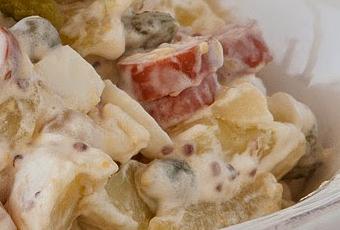 3 salchichas Bockwurst10-15 cebollitas en vinagre20 pepinillos pequeños en vinagre aproximadamente1 huevo duro1 cucharada de alcaparras200 ml de mahonesa 1 cucharada de mostaza de Dijon a la antiguaPreparación:Cocer las patatas limpias y con la piel en abundante agua salada.Dejar enfriar y retirar la piel.Cortar en trozos que no sean muy pequeños.Añadir la salchicha cortada en rodajas, el huevo duro picado.Escurrir los encurtidos del vinagre. Picar los pepinillos en trozos medianos y añadir al resto de ingredientes junto con las alcaparras y las cebollitas cortadas por la mitad.Remover para que los ingredientes se mezclen por igual.Mezclar la mahonesa con la mostaza e incorporar a la ensalada.Conservar en el frigorífico hasta su consumo.Riquísima acompañada de una cerveza helada!!