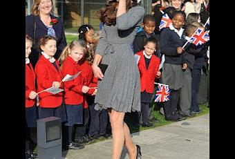 Kate Middleton eligió un vestido gris con un detalle negro en el cuello efecto collar de flores, manga francesa y falda plisada por encima de la rodilla, de Orla Kiely, que combinó con zapatos negros de salón de Christian Louboutin. La Duquesa llevaba además una pulsera de Tiffany & Co. y su anillo de pedida.