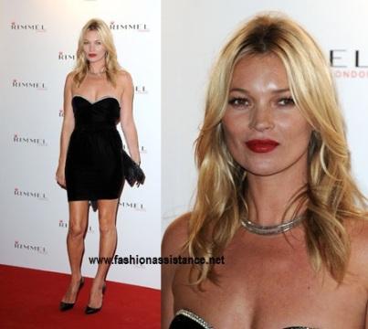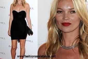 Kate Moss, muy bronceada posa con un minivestido negro de escote corazón ribeteado con pedrería y cremallena trasera y zapatos de salón de Christian Louboutin en la noche de celebración de sus diez años de colaboración con Rimmel. Look ganador!