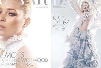 ¿Cuál es el secreto de Kate Moss? Muchas modelos más guapas y jóvenes que ella se lo preguntan cuando la ven a sus 37 años en todo su esplendor y siendo doble portada en Harper's Bazaar UK, mayo 2011. A la derecha Kate aparece magnífica, con un espectacular vestido entre flamenco y fantasmagórico de Alexander McQueen, otoño 2066, fotografiada por Solve Sundsbo. A la izquierda la modelo muestra su lado más recatado y lady.
