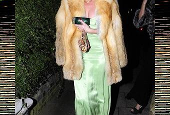 Añadir un abrigo corto vintage de zorro en color caramelo a un escotado vestido de raso verde quizá no sea la mejor opción para lograr un outfit ganador. Si a eso le añadimos un maquillaje exagerado unos ricitos poco favorecedores, el resultado final es desastroso aunque lo lleve la mísmisima Kate Moss. Ni siquiera las magníficas sandalias de Yves Saint Laurent logran destacar.