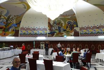 A las siete y media de la mañana bajamos a desayunar. No nos esperábamos un salón tan imponente y es que este hotel es de la época zarista. Hay pintados en el techo ovalmotivos orientales y de música y nos encanta.