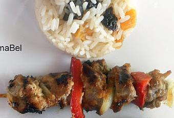 Esta es una receta del gran chef venezolano Sumito Estevez. La receta la copié de la web de elgourmet.com y les transcribo la parte que hice, o sea, los kebabs y el arroz.