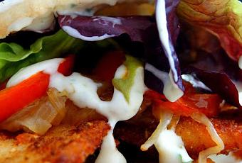 Después solo es cuestión de montarlo. Cogemos el pan de pita, lo abrimos un poco más de la mitad con un cuchillo de sierra, salseamos y metemos la lechuga primeramente, después las rodajas de tomate frito, a continuación la cebolla dorada, volvemos a salsear, colocamos la pechuga y de nuevo salsa. Cogemos papel de cocina o aluminio y envolvemos medio kebab antes de presentar. Ayudará a que el kebab se mantenga caliente y a nosotros nos facilitará comerlo más cómodamente.