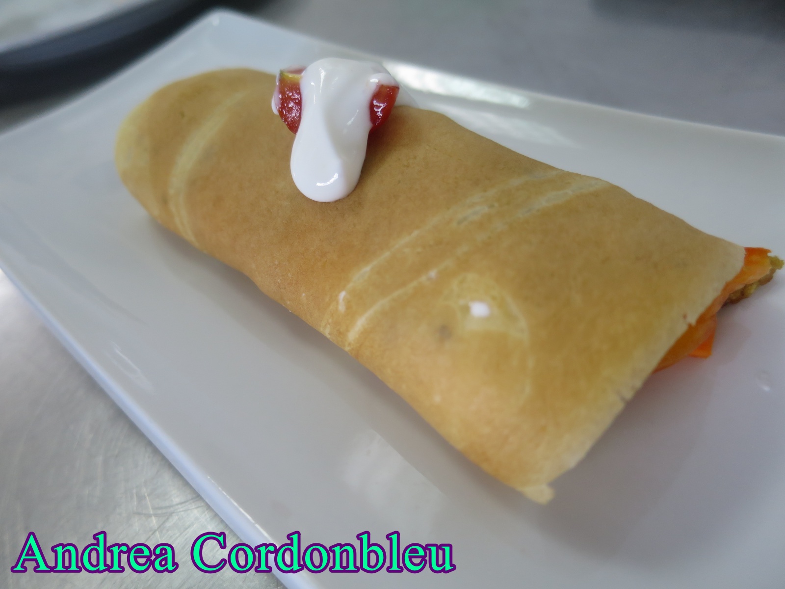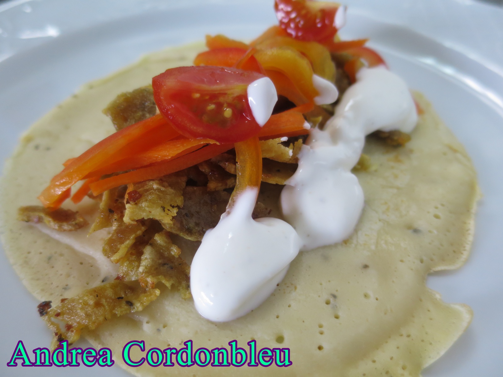 Se calienta una sartén especial para crêpes y se moja con un poco de mantequilla. Se vierte en ella un poco de la mezcla hasta que cubra el fondo y se reparte la masa para que quede bien fina.Tras un minuto se le da la vuelta con una espátula y se deja que se haga durante un minuto por el otro lado.Se van reservando y se procede de igual modo hasta terminar la masa.Para la salsa tzatziki se trituran todos los ingredientes. También se pueden triturar todos menos el pepino y las hojas de menta o hierba buena que se añadan en trocitos pequeños. Se limpia toda la hortaliza elegida y se corta en juliana. Para montarlo se coloca la oblea, se pone un poco de seitán salteado, el acompañamiento al gusto, se salsea y se cierra. Se puede pasar por la plancha, para que quede más crujiente.