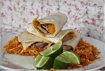12. Rellenamos entonces con un par de cucharadas de los filetes de pato y la naranja a la parrilla y salseamos con una cuchara de salsa de yogur y miel... lo enrollamos bien ¡¡y a comer!!.