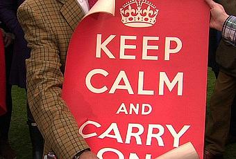 Uno de aquellos lemas, cuya traducción es “Mantén la calma y sigue adelante”, jamás fue utilizado, y las miles de copias que se hicieron fueron destruidas a excepción de unas pocas, que sobrevivieron hasta el año 2000, cuando volvió a salir a la luz. Se convirtió en un objeto de decoración principalmente por sus colores llamativos y por su texto agradable, y como tenía un diseño tan sencillo, era fácil modificarlo y adaptarlo a los gustos personales de cada uno. Keep Calm es ahora de dominio público y sigue los pasos del smiley y de otros iconos de la cultura popular, aunque no sepamos muy bien de dónde salen.