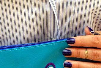Unos shorts blancos rotos, camisa blanca de rayas azules (clásico y básico) y el clutch con la Mano de Fátima estampada pone el punto y final a un outfit cómodo, clásico y versátil.